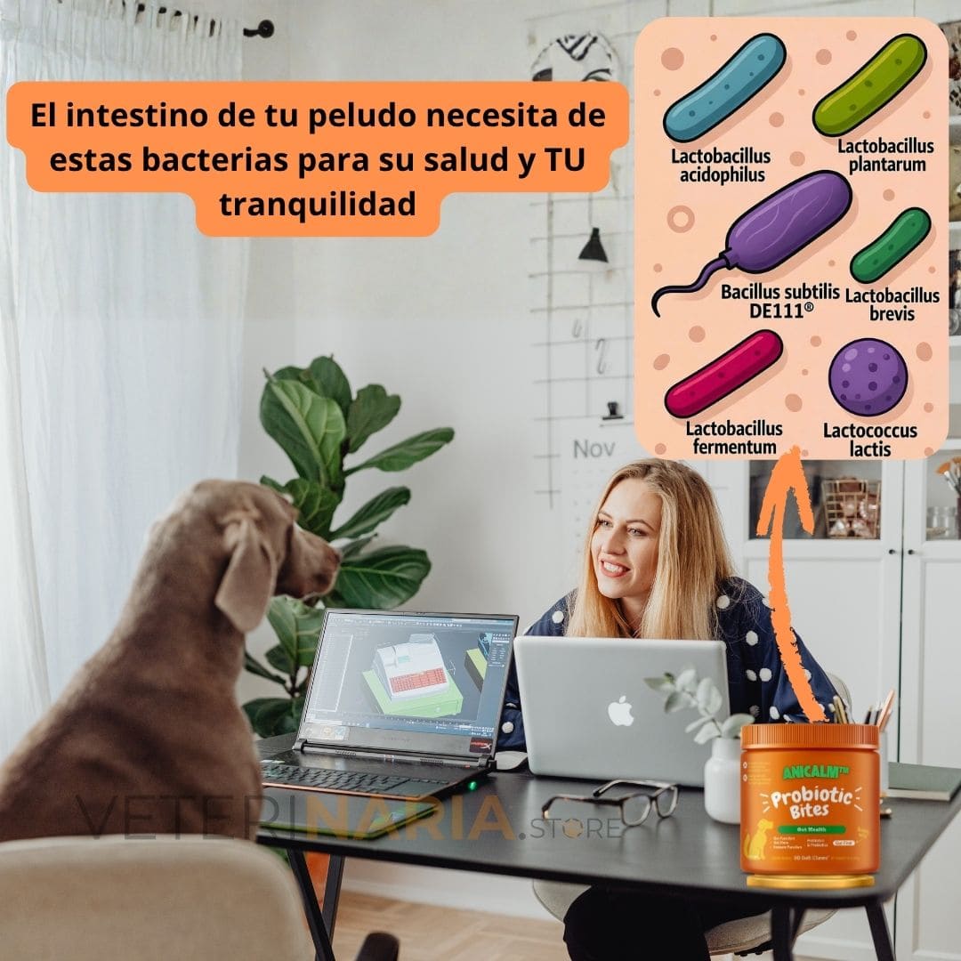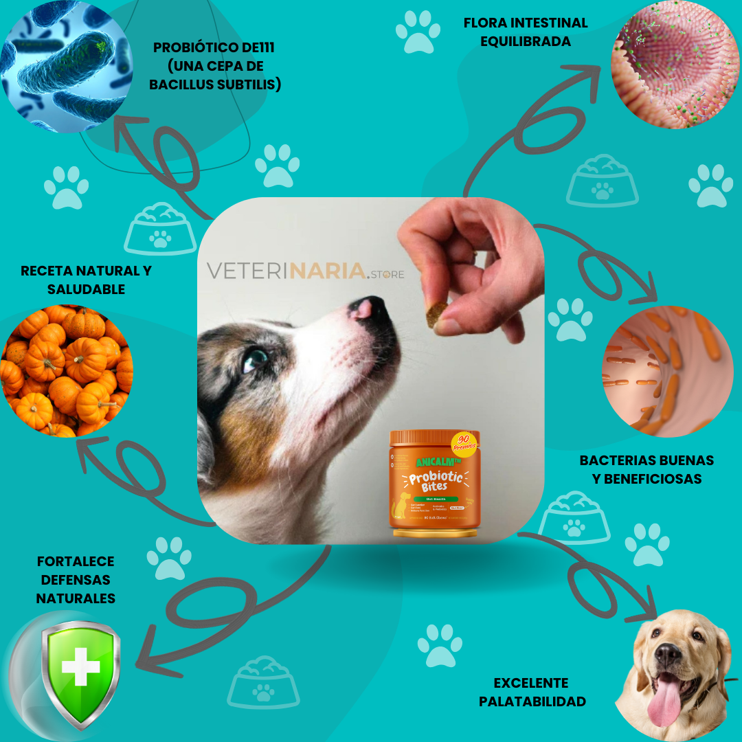 Los suplementos con probióticos son funcionales, en forma de suaves bocaditos que apoyan la flora intestinal y el sistema inmunológico de tu compañero canino.